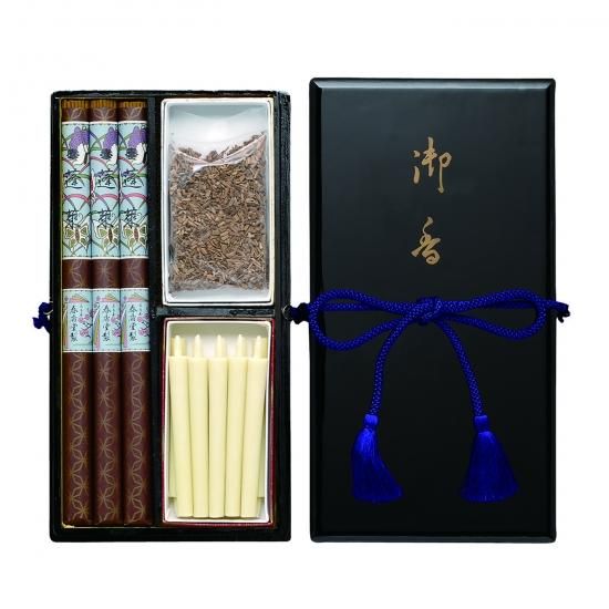 蓬莱三種香 黒塗箱 長寸線香3把・沈香刻・和蝋燭入